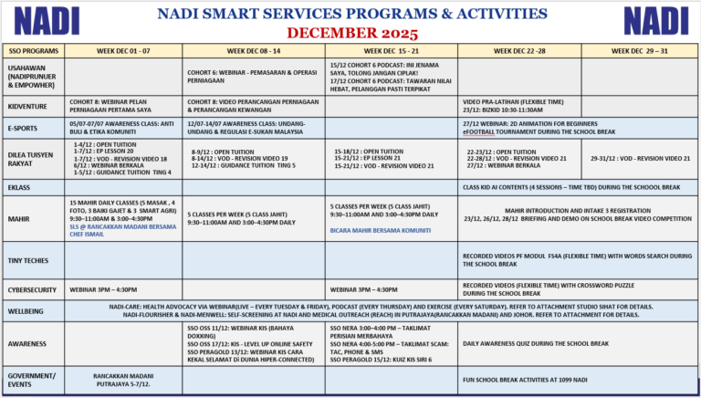 Tarikh : 22 – 30 Disember 2025 Masa : 10.00 am – 5.00 pm Tempat: NADI Felda Gunung Besout 1 PROGRAM & AKTIVITI: Live Webinar : Cuti Sekolah Bijak & Produktif Kempen Internet Selamat :KIS & KITA (I) Tuisyen Rakyat […]